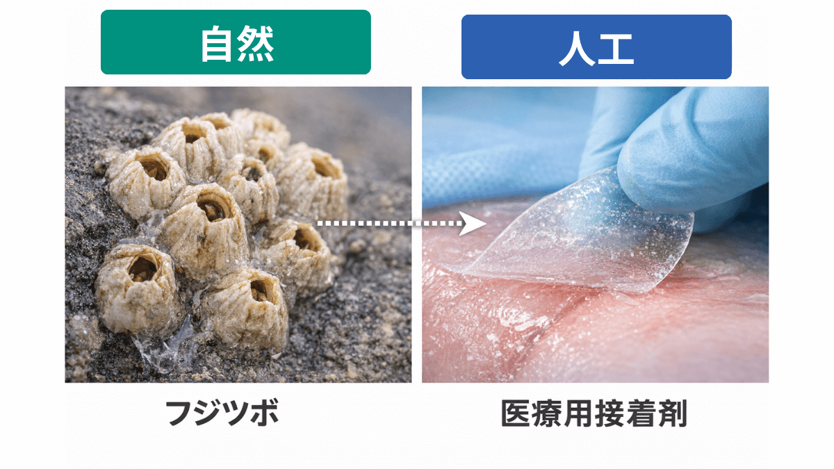 次の応用例として、フジツボの付着機構を模倣した医療用接着剤が挙げられる。2021年、マサチューセッツ工科大学の研究チームは、海中という過酷な環境下でも岩や船底、生物の甲羅などに強固に付着するフジツボの粘着性物質に着目し、新しい医療材料を開発した。