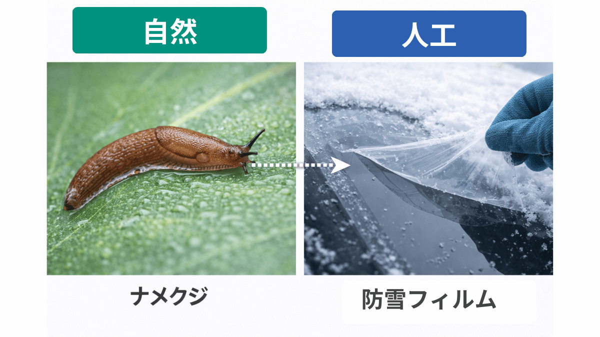 続いて、防雪フィルムが挙げられる。これは、液体や汚れが付着しにくいナメクジの体表構造に着目して開発された技術である。研究者は、ナメクジが常に湿潤な環境下でも異物の付着を抑えられる点に注目し、その仕組みを人工材料に応用した。