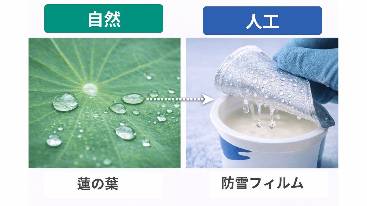 この構造と原理を模倣し、樹脂フィルム表面に細かな凹凸加工と撥水処理を施すことで、ヨーグルトなど粘性の高い内容物がフタ裏に付着しにくくなった。その結果、開封時に中身が垂れにくく、手や周囲を汚しにくいという利便性が実現している。食品ロスの低減や使用時の快適性向上にも寄与する点で、日常製品におけるバイオミメティクスの有効性を示す代表的な事例である。